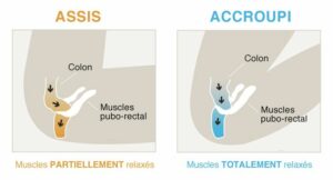 Grâce à la position accroupie, l’angle ano-rectal est alors droit, sans coude, les muscles pubo-rectaux et le sphincter sont totalement relaxés et l’évacuation des selles se fait plus facilement :