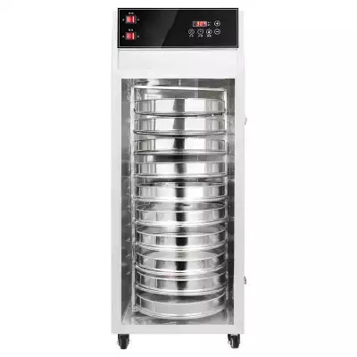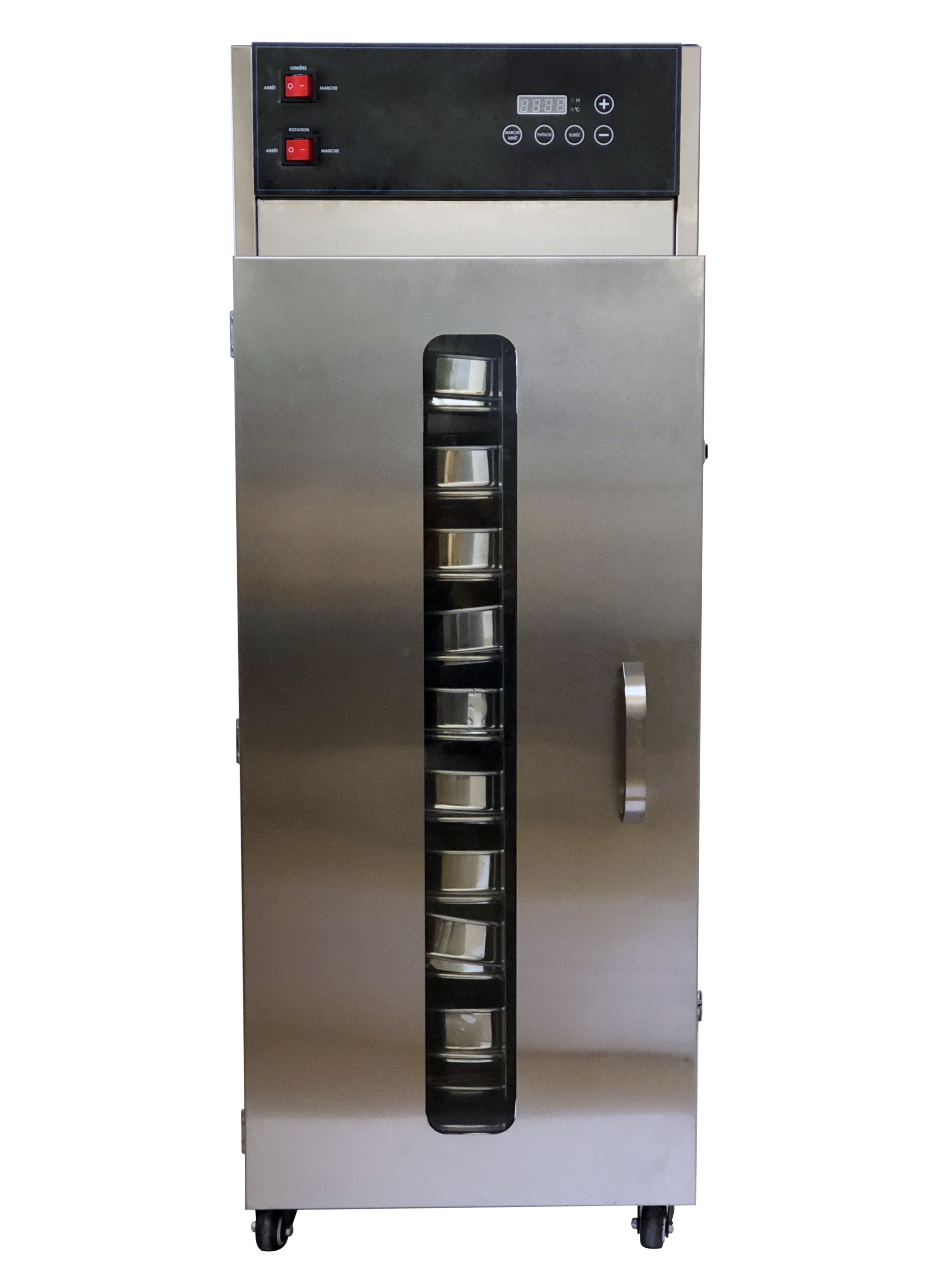 Déshydrateur 10 grilles rotatives ( la chaleur est pulsée et les grilles tournent sur elles mêmes) pour une déshydratation totalement homogène (pas besoin de tourner les grilles en cours de processus) entièrement en inox à commande digitale