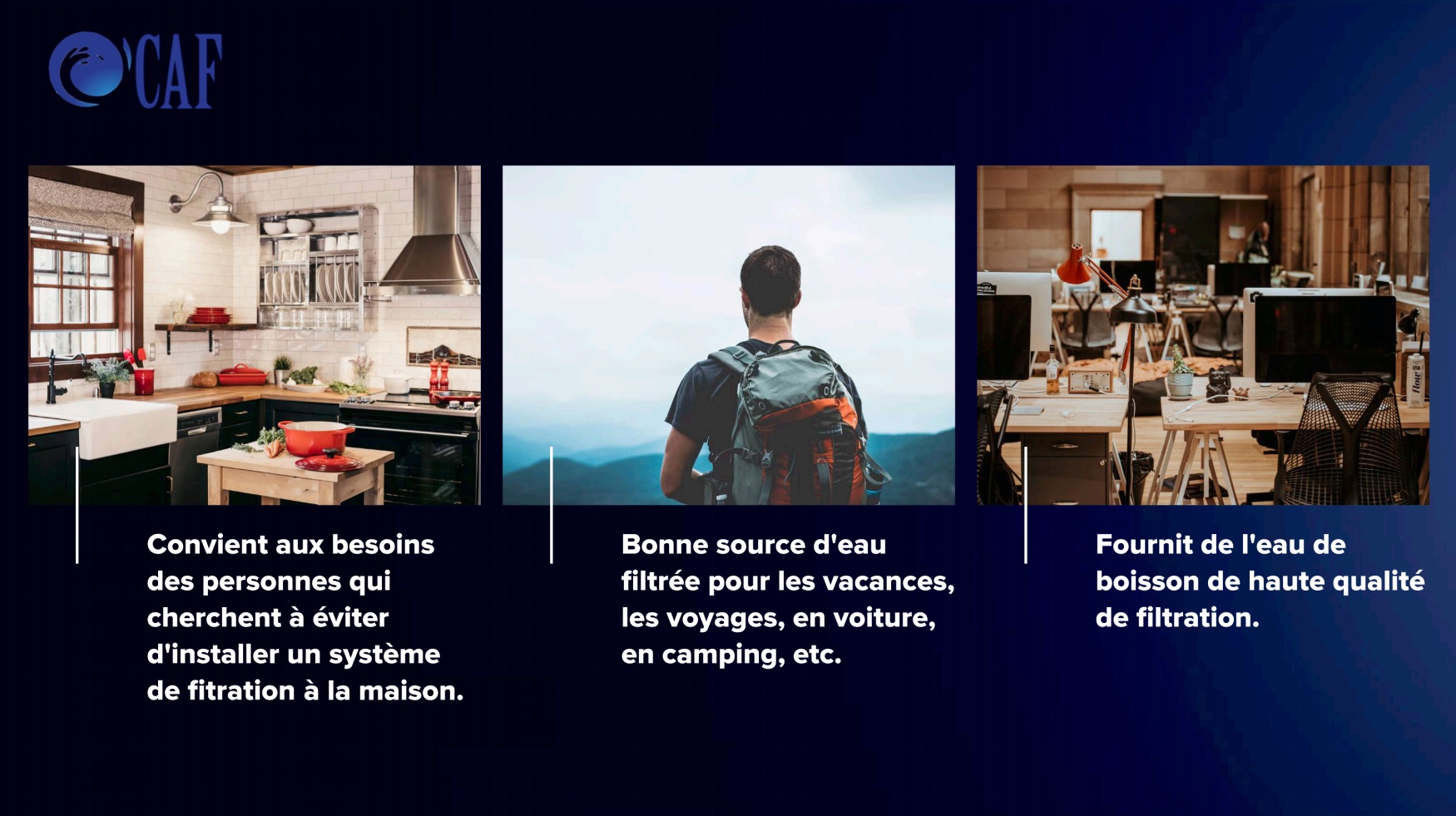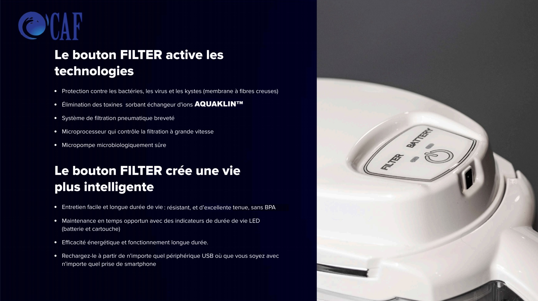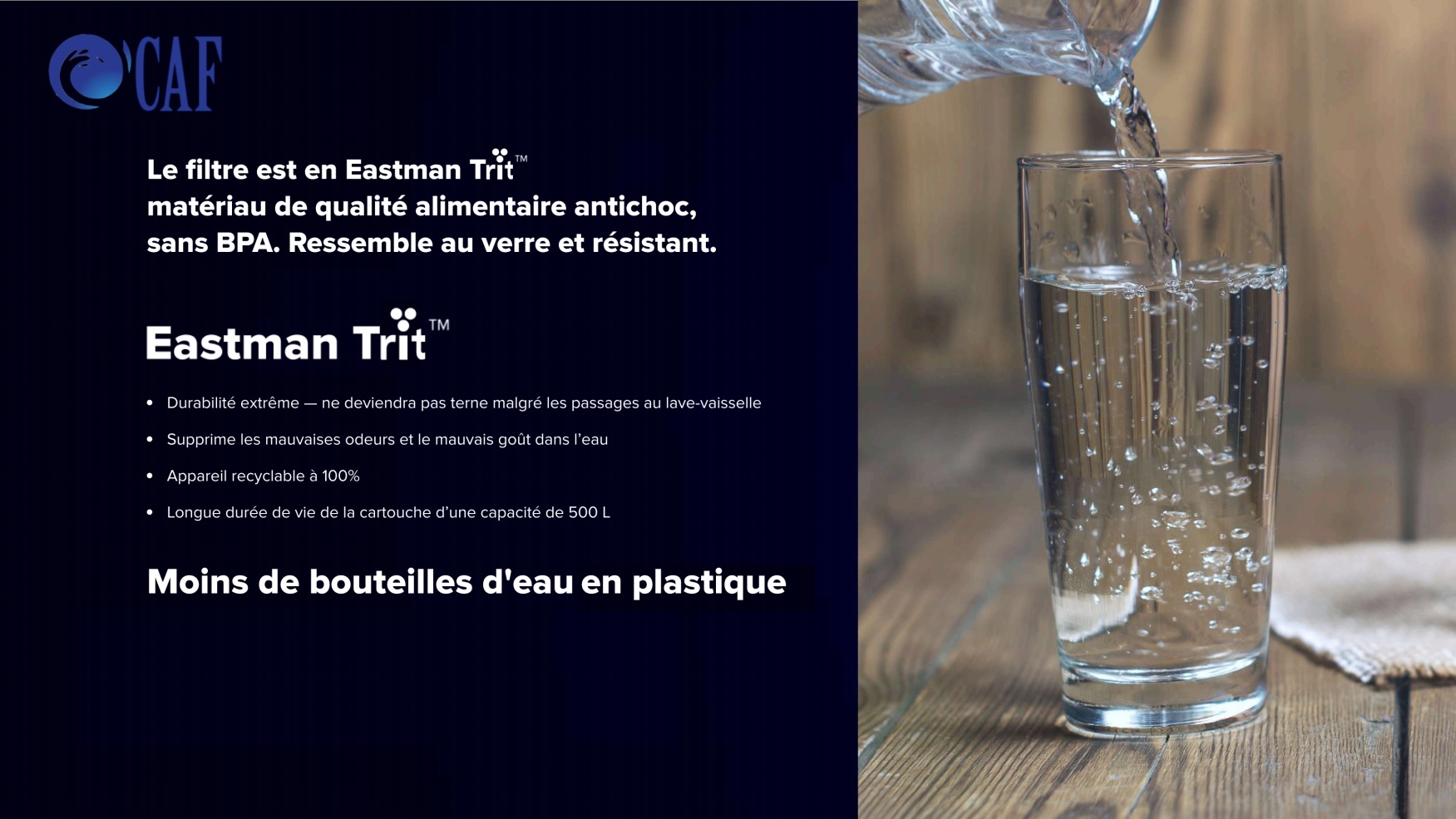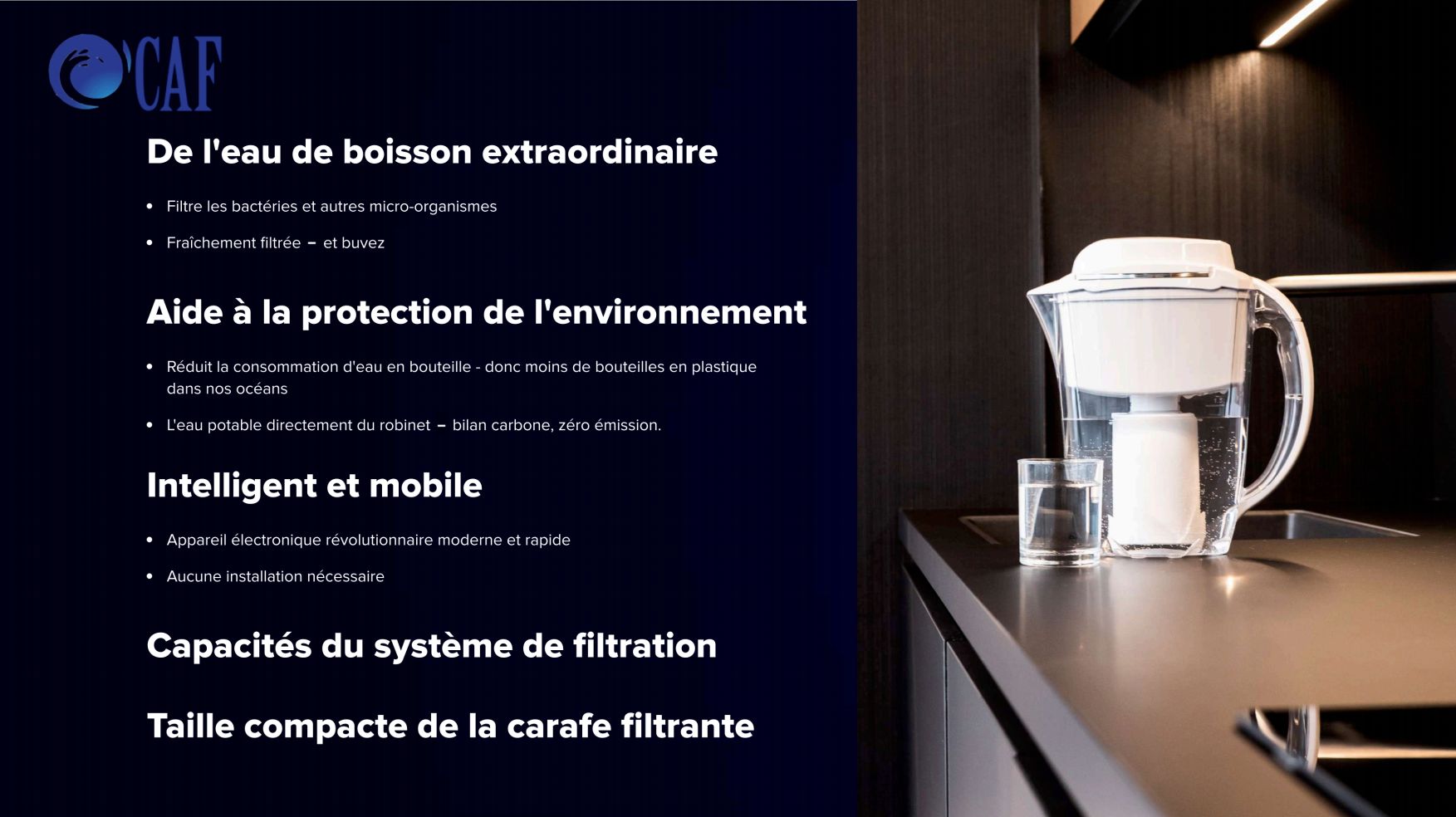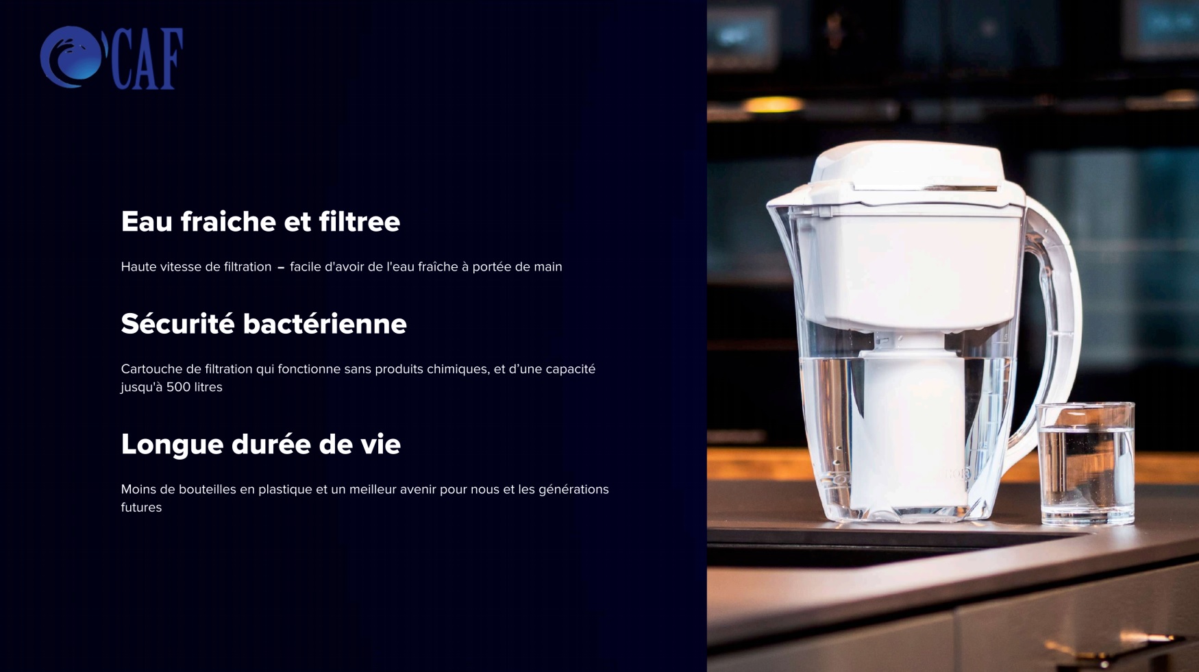 Validée et certifiée par la laboratoire ITGA – Groupe CARSO, la carafe filtrante O’CAF est la seule à offrir de l’eau purifiée dépourvue de toute contamination avec une installation simplissime sans maintenance et assurant jusqu’à +/- 500 litres d’eau.