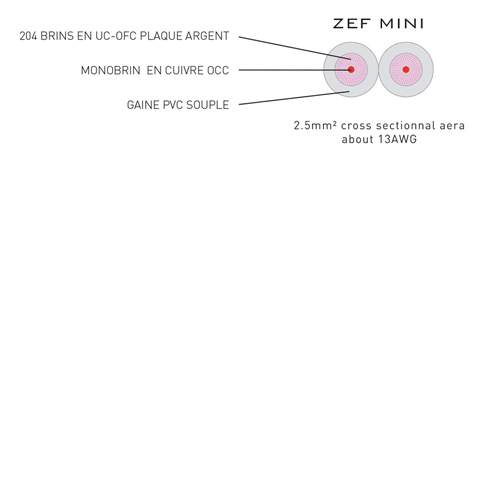 Le câble ZEF MINI utilise une structure conductrice similaire à celle du ZEF SPEAKER (1 monobrin de cuivre OCC / toron cuivre UC-OFC argenté).