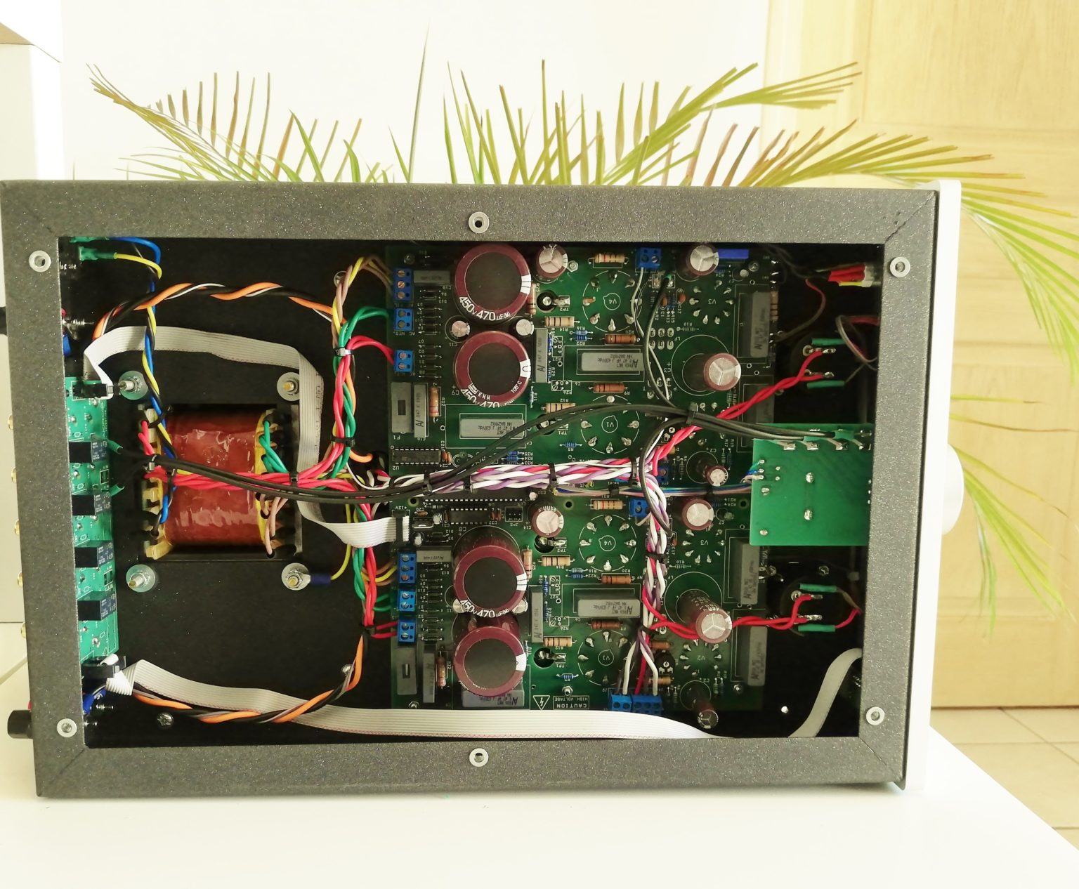- Câblage « en l’air » des courants forts : alimentation et sortie HP avec torons de câbles de 1,5mm2.