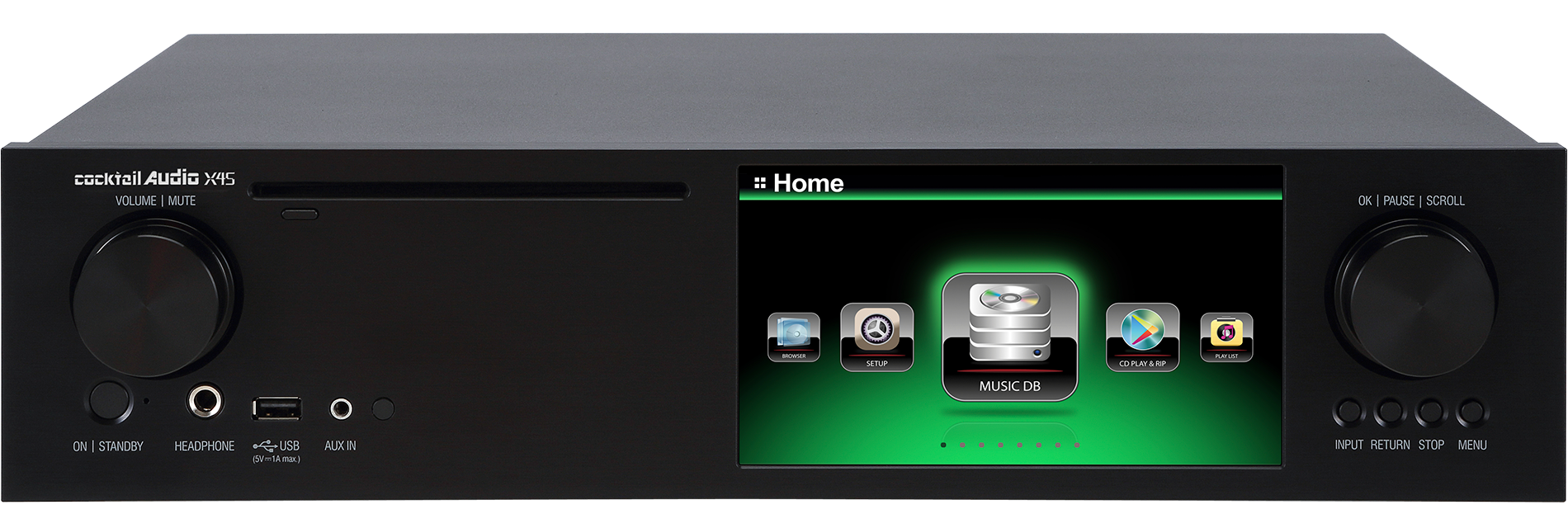 Application propriétaire Cocktail Audio : visualisation des pochettes, des morceaux, contrôle de volume, création de playlists, rippage des CDs etc.