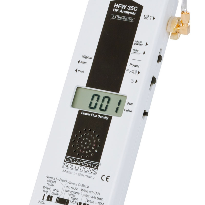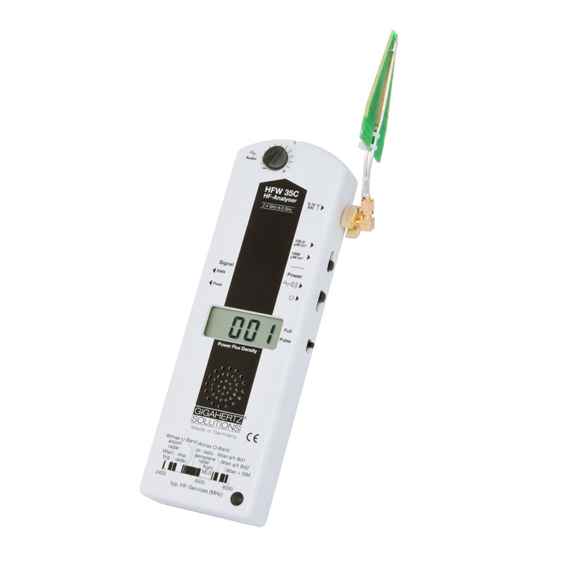 Cet appareil de mesure hyperfréquences permet les mesures de champs électromagnétiques sur la bande de fréquences de 2.4 GHz à 6 GHz (Wifi 2.4 GHz et 5 GHz, Bluetooth, Wimax et certains radars) avec une fonction d’analyse audio. Il est un bon complément au HF35C, HF38B et HFE35C afin de couvrir une bande de fréquences plus large.