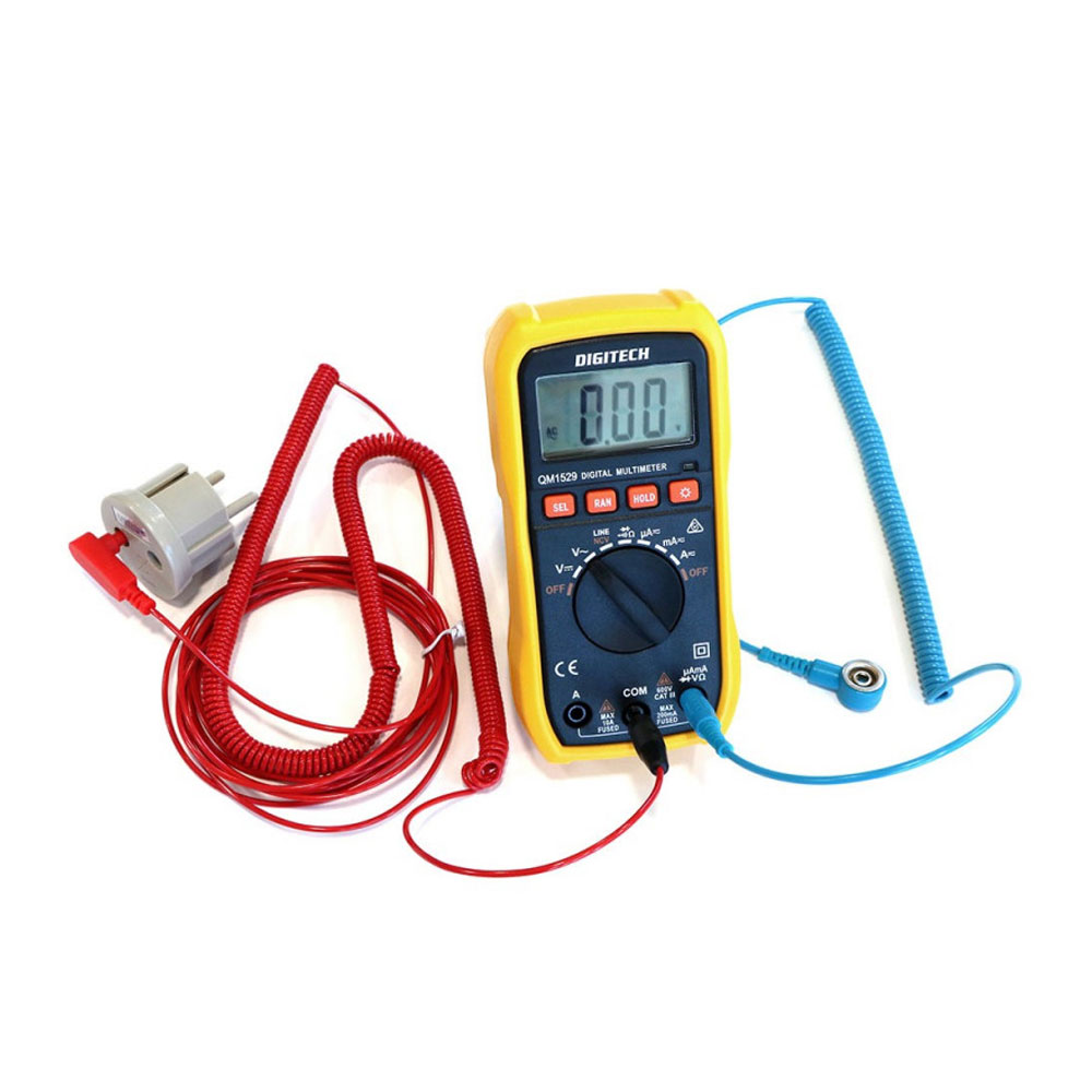 - Inclus dans ce kit : Multimètre, fiche Earthing de raccordement à la terre, cordon avec bouton pression pour la mesure de la tension induite du corps et notice en Français